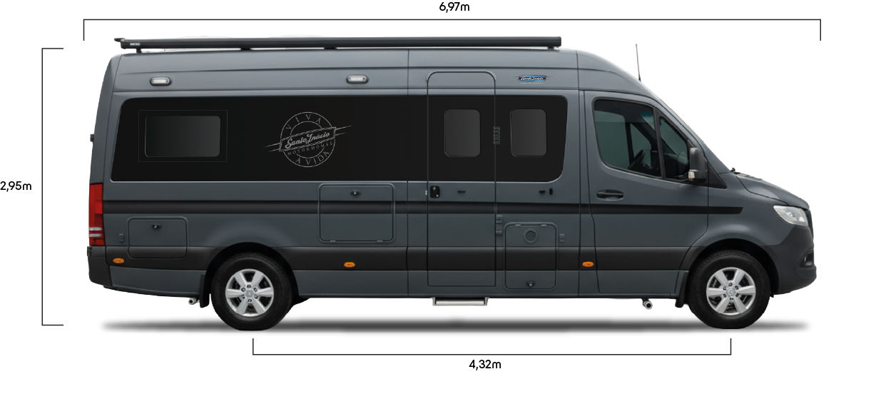 Comprimento total: 6,97 m Largura (retrovisores abertos): 2,35 m Altura externa: 2,95 m Entre-eixos: 4.330 mm Peso bruto total (PBT): 4.100 kg Essas dimensões equilibram espaço interno com manobrabilidade em centros urbanos e campings.